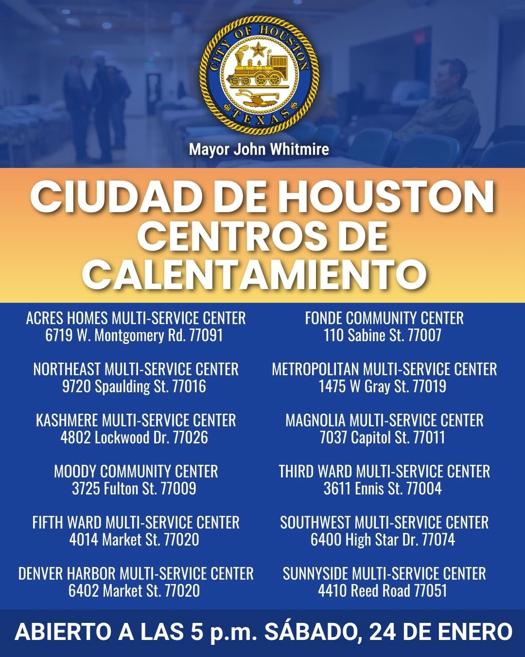 The City’s warming centers will remain open 24/7 until further notice. Through a partnership with CenterPoint Energy, every warming center is now equipped with a generator to ensure power and heat are maintained during the freeze.