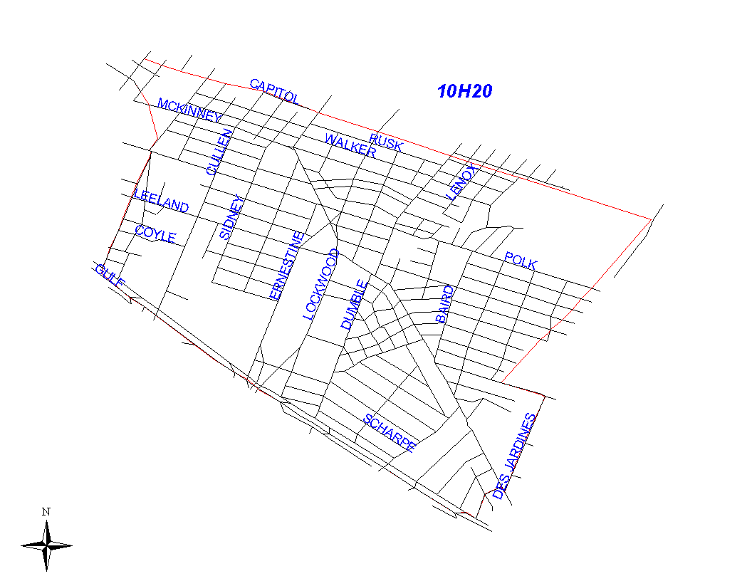 The boundary begins at the intersection of the MKTMP railroad and Sampson Street and follows the railroad east to the intersection with the HB&T railroad. The boundary turns southwest along the HB&T railroad to Lawndale. The boundary turns southeast on Lawndale and goes about a quarter mile to Des Jardines. Lawndale is the responsibility of 10H20. The boundary continues southwest along the northwest lot lines of Des Jardines to the Gulf Freeway. Des Jardines is the responsibility of 11D10. The boundary turns northwest on the Gulf Freeway to the HB&T railroad. This segment of the Gulf Freeway is the responsibility of 10H20. The boundary follows Milby north to the intersection with the HB&T railroad. It follows the railroad to Sampson where it turns north to the intersection with the MKTMP railroad track, where it begins. Milby and Sampson are the responsibility of 10H30's beat.