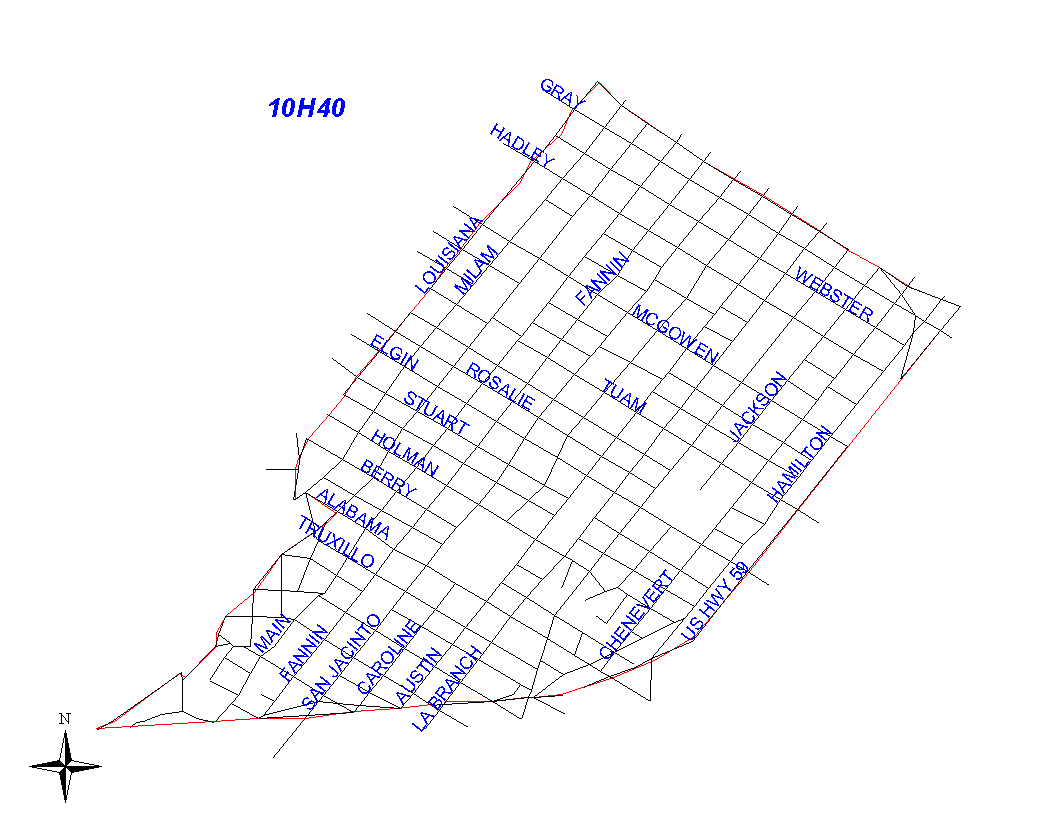 The boundary begins at the intersection of I-45 where it crosses over Louisiana Street and goes southeast on I-45 to the intersection with I-59. I-45 is in the jurisdiction of 1A10's beat. The boundary turns southwest on I-59. The southwest segment is in the jurisdiction of 10H50's beat. I-59 intersects with I-288 and turns west. The boundary follows I-59 west to its intersection with the Spur 527. The west segment of I-59 (Southwest Freeway) is the responsibility of 10H40. At the Spur 527, the boundary turns northeast to Louisiana and continues northeast on Louisiana to I-45, which is where it begins. Louisiana and Spur 527 are in the jurisdiction of 1A20's beat.