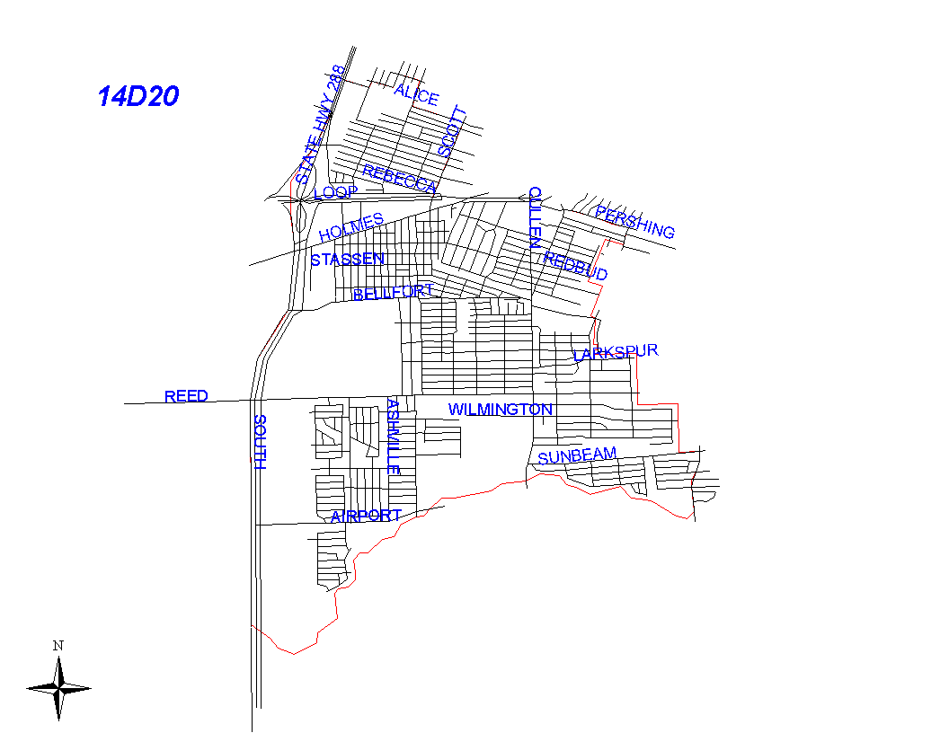 The boundary begins at the intersection of the South Freeway and Alice and goes east on Alice to Del Rio, north on Del Rio for one block to Idaho, east two blocks on Idaho to Lozier, north one block on Lozier to Ward, two blocks east on Ward to Winton, three blocks south on Winton to Southlawn, and east on Southlawn to Scott. All of these streets are in 14D10's beat. The boundary turns south on Scott to the South Loop. Scott is in 14D20's beat. The beat boundary follows the South Loop east to Bastian. It takes Bastian to Pershing, and Pershing east to the intersection of Pershing, Calhoun, and the South Park subdivision boundary. (See City of Houston Tax Maps, Page 229, 5454, D3-D4). On the south of Pershing and east of Calhoun is the South Park Subdivision. The beat boundary goes along the north boundary of South Park Subdivision, then along the east boundary of the South Park Subdivision at Jutland. A half block south of Vanfleet on Jutland, the South Park Subdivision boundary turns west. The beat boundary follows this subdivision boundary west. About a half block west of Darney, an alley turns south from the subdivision boundary and runs into the subdivision boundary between the Southland Acres and Smallwood Terrace Subdivisions. The beat boundary follows the alley to the subdivision boundary and continues along the subdivision boundary to Bellfort. About one-half block east on Bellfort is the intersection with Jutland. The next intersection on Bellfort is Panay. About halfway between Jutland and Panay, a subdivision boundary goes south. The beat boundary follows this subdivision. The subdivision boundary turns east along the lot lines just south of Westover Street. This line continues about one-half block west of St.Lo Street. The beat boundary follows this line for approximately five blocks east. The Inwood Terrace Subdivision boundary turns south between Noel and Rockford. It turns east between Hirondel and Carmen. The beat goundary follows this subdivision boundary south and east. The subdivision boundary turns south again about a half block east of Merle Street. The beat boundary follows this subdivision boundary south. Just before sunbeam, it follows the lot lines along Bayfield to Martin Luther King Boulevard. The beat boundary follows Martin Luther King Blvd. south to Sims Bayou. Martin Luther King blvd. is the responsibility of 14D30's beat. It follows Sims Bayou west to the South Freeway. The boundary then follows the South Freeway north to the intersection with Alice where it begins. The South Freeway is the responsibility of 14D20.
