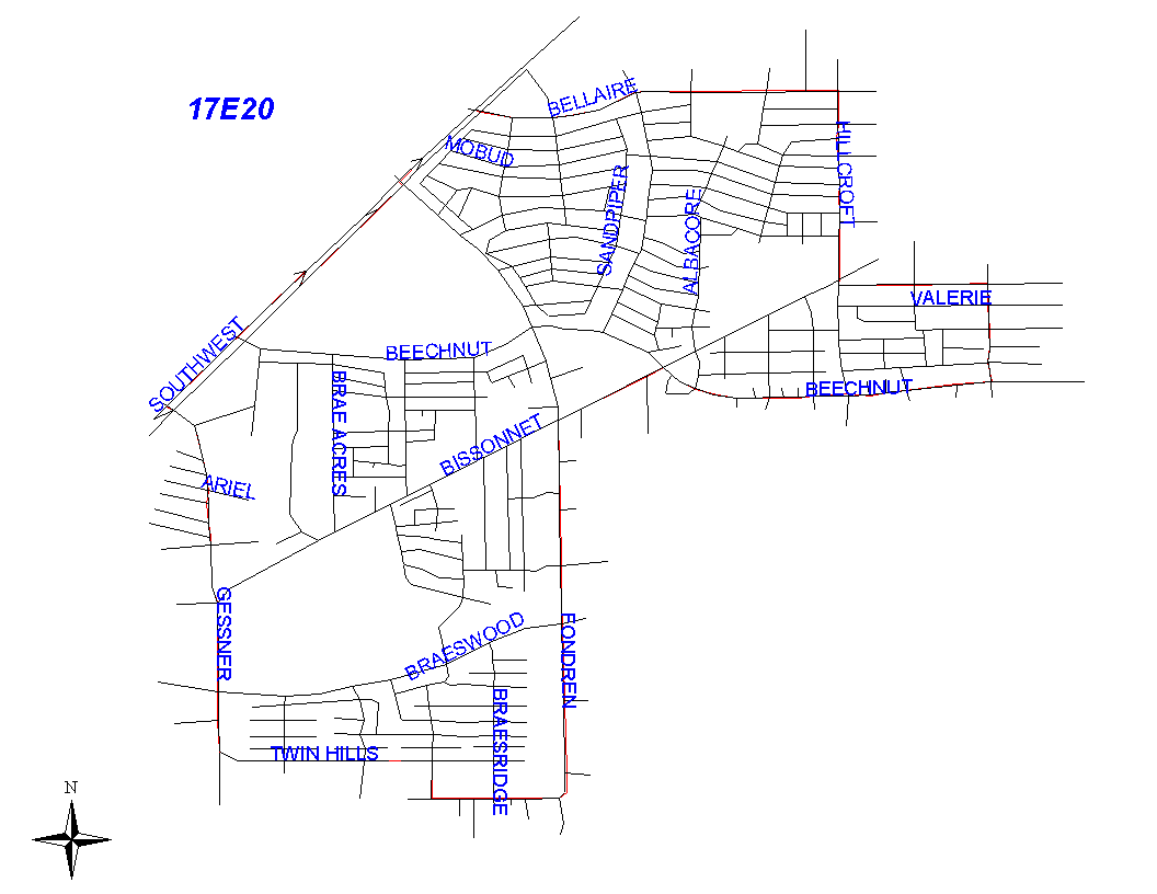The boundary begins at the intersection of the Southwest Freeway (I-59) and Bellaire Boulevard and goes east along the south lot lines of Bellaire Boulevard to Hillcroft. It turns south along the west lot lines of Hillcroft to Pine. It turns east along the north lot lines of Pine to the Bellaire City Limits that follows Renwick. It turns south along the Bellaire City Limits and goes to Maple. At Maple, the Bellaire City Limits turn east while the beat boundary continues south along the east lot lines of Renwick to Beechnut. It turns west along the north lot lines of Beechnut to Bissonnet. It turns southwest along the southeast lot lines of Bissonnet to Fondren. The boundary goes south along the east lot lines of Fondren to Creekbend. It then turns west along the north lot lines of Creekbend and goes to Valley Hills. The beat boundary turns north along the east lot lines of Valley Hills and goes to Twin Hills. The boundary continues west along the south lot lines of Twin Hills and goes to South Gessner. It turns north along the east lot lines of South Gessner to the Southwest Freeway. It turns northeast along the south side of the Southwest Freeway and goes to the intersection with Bellaire Boulevard, which is where it begins.