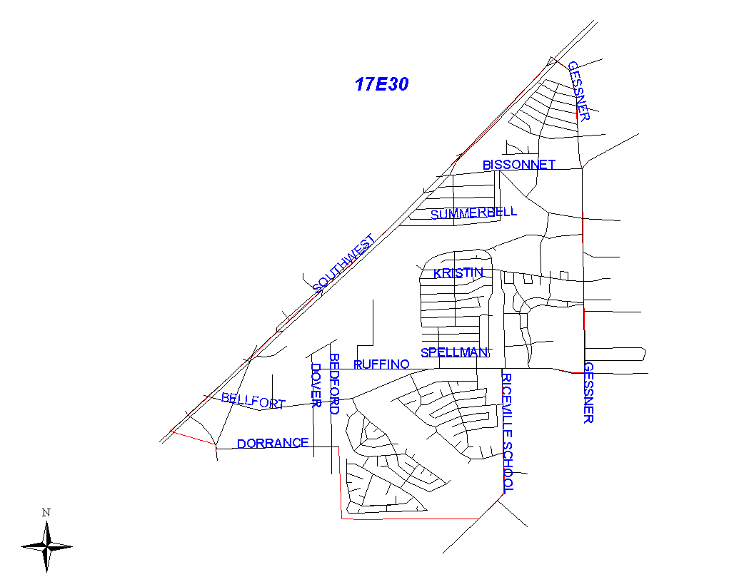 The boundary begins at the intersection of the Southwest Freeway (I-59) and Gessner and goes south along the east lot lines of Gessner to West Bellfort. It turns west along south lot lines of West Bellfort and goes to Riceville School Road. The boundary turns south along the east lot lines of Riceville School Road and goes to the Houston City Limits. The beat boundary follows the city limits boundary west along West Airport Boulevard to Jebbia Road, north on Bedford Road to Dorance, and west along Dorance to the Southwest Freeway. At the Southwest Freeway, the city limits continue west while the beat boundary turns northeast along the south side of the Southwest Freeway to the intersection with Gessner, which is where it begins.