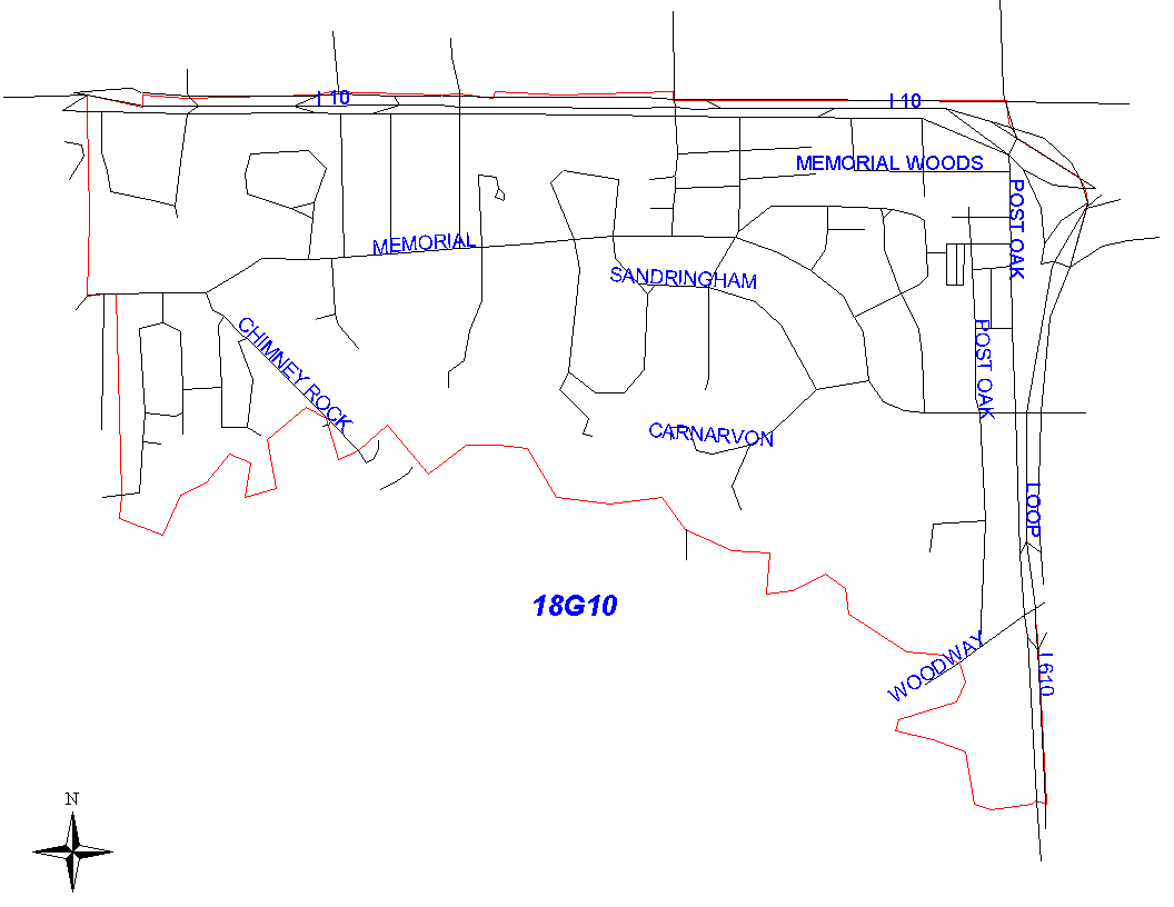 The boundary begins at the intersection of the Katy Freeway (I-10) and the Hunters Creek City Limits and goes east on the Katy Freeway to the intersection with the 610 Loop West. The Katy Freeway is the responsibility of 18G10. The boundary turns south on the Loop and goes to where the Loop crosses the Buffalo Bayou. The Loop is the responsibility of 18G10. The boundary turns west on the Buffalo Bayou and goes to the Hunters Creek City Limits. It turns north and follows the city limits to Katy Freeway where it begins.