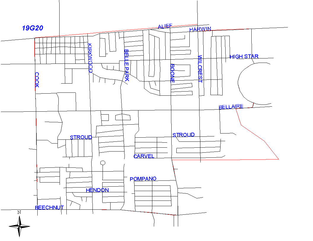 The boundary begins at the intersection of Cook and the SPRR railroad that runs parallel with Alief Clodine. The boundary goes east along the railroad to Wilcrest. It turns south along the east lot lines of wilcrest and goes to Harwin. It turns east along the north lot lines of Harwin and goes to a drainage that runs parallel to Linnhaven on the east side. It turns south and follows the drainage ditch to the Brays Bayou. It continues south on the Bayou to the drainage ditch that runs parallel to Sela on the north side. It follows this drainage ditch to the east lot line of Imperial Point Subdivision at 10600 Block of Sela south, south of east line of Imperial Point Subdivision to the south lot line of Hazen, west on the south lot lines of Hasen to the west lot lines of Boone Road. The boundary turns south along the west lot lines of Boone Road to Beechnut. The boundary follows the south lot lines of Beechnut to Cook Road. It turns north on Cook Road and goes along the east lot lines to the SPRR railroad, which is where it begins.