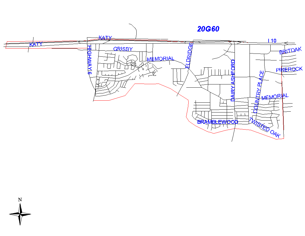 The boundary begins where the Houston City Limits turn north off of the MKT railroad tracks just north of the Katy Freeway and follows the railroad tracks east from the city limits to Carlingford. The boundary turns south along the west lot lines of Carlingford and goes to Pershire. It goes southeast on Pershire to Bateswood and continues straight south on Bateswood to Memorial Drive. It turns west on Memorial Drive and goes to Rancho Bauer. It continues south on Rancho Bauer to the Buffalo Bayou. Addresses on both sides of Carlingford, Pershire, Bateswood, Memorial Drive, and Rancho Bauer are the responsibility of 20G50. The boundary turns west along the Buffalo Bayou. Just west of Dairy Ashford, the city limits follow the Buffalo Bayou to Highway 6, where they turn north and south around Barker Reservoir. The beat boundary follows the city limits to the reservoir and then continues along the Buffalo Bayou to Obrien Road. It runs north on Obrien to the city limits. Obrien is the responsibility of 20G60. It turns east as the city limits go east along the Katy Freeway. It follows the city limits until they turn north off of the MKT railroad, which is the point at which the beat boundary begins. This segment of the Katy Freeway, which is in the city limits, is the responsibility of 20G60. Although the beat includes a portion of Barker Reservoir, the activities of the field officers will be concentrated east of Addicks Howell Road.
