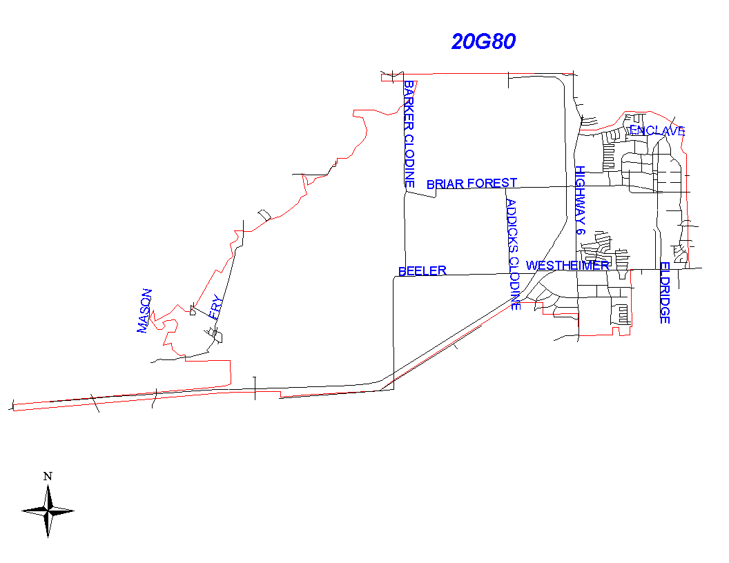 The boundary begins at the Houston City Limits just south of 16350 Katy Freeway. The city limits travel west to approximately 17800 Katy Freeway, just west of Barker Cypress Road. They city limits then turn south one block to Cypress Chase Road. The city limits then turn east following Cypress Chase Road to Houston Chronicle Boulevard. From this point, the beat boundary follows the city limits west/southwest to the intersection of Baker Road and Kessington. It continues west/southwest following the city limits across Westheimer to Buffalo Bayou, south from Buffalo Bayou about three quarters of a mile, then east, then south to Barker Dam. It then travels east three quarters of a mile, then turns south the the Southern Pacific railroad, which it follows east to FM 1093 and northeast to South Richmond Road. One block northeast of South Richmond Road, the city limits travel east one half mile, then south to Branch Forest. They follow Branch Forest east to Highway 6, Highway 6 south to Westpark, east on Westpark to Westhollow, north on Westhollow to Naomi, east then north again to Jewel Ann, north on Jewel Ann across Richmond Avenue, continuing north north on Panagard to Westheimer Beeler. It follows the city limits east on Westheimer Beeler to Rolk, north on Rolk, east on Wichersham, north just north of Rincon, then due north to the intersection of Sandbridge Drive and Eldridge Parkway. The boundary then follows Enclave Parkway north to the northern border of Terry Hershey Park and continues to follow the Park's border north and west to the city limit line just north of Peach-Wood Bend. It follows the city limits south to Enclave Parkway, then west to 13700 Stokes Mount. It turns south and follows the city limits to Briar Forest, then west on Briar Forest to Highway 6, north on Highway 6 to a point just north of West Way Lane, east to Forest Home, north on Forest Home to a point just south of Briarhills Parkway, then west along Briarhills Parkway to the east side of Highway 6, south along Highway 6 to the 1300 Block of Highway 6, then north on the west side of Highway 6 to a point just south of Grisby Road. It follows Barker Dam west to 16300 Katy Freeway, where the boundary began.