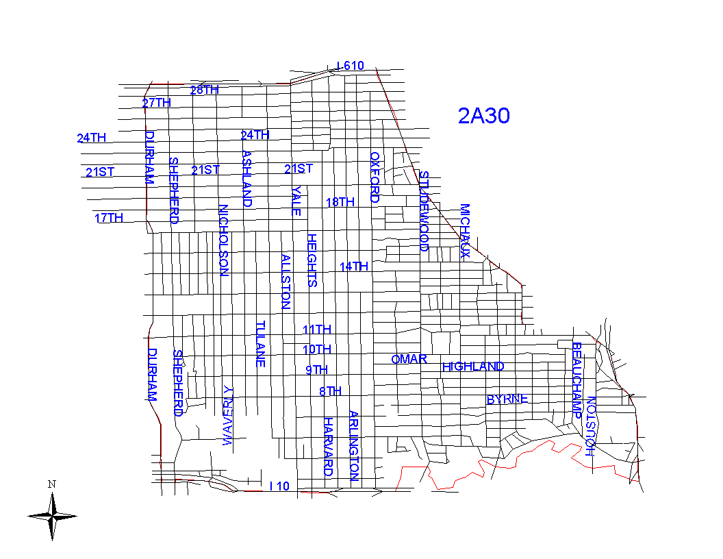The boundary begins at the intersection of 610 Loop North and North Durham and goes east along the south feeder road of the Loop to North Main. The Loop is the responsibility of District 3. The boundary turns southeast along the southwest lot lines of North Main to Moss. It turns south along the west lot lines of Moss to Bruce and continues south along the west lot lines of Bruce to Pecore. It turns east along the south lot lines of Pecore to the intersection of North Main and Pecore, and continues southeast along the southwest lot lines of North Main again to the intersection of North Main and I-45. the boundary turns south on I-45 to the intersection with the White Oak Bayou and follows the middle of the White oak Bayou of it's intersection with I-10 (Katy Freeway). It follows I-10 west to the intersection with North D urham. I-10 is the responsibility of 2A30. It turns north on the east property lines of North Durham to its intersection with the 610 Loop North, which is where is begins. Durham is the responsibiity of 3B20 from the intersection of the 610 Loop to the intersection of Durham and the M.K.T.R.R. railroad. From the railroad to I-10 Durham is the responsibility of 2A30.