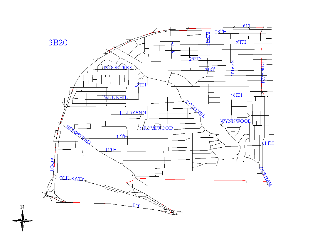 Beginning at the intersection of the 610 North Loop West and the Hempstead Highway, the boundary goes north and east on the Loop to North Durham. This segment of the Loop is the responsibility of 3B10 and 3B30. It turns south on North Durham to the MKT railroad tracks. Addresses on both sides of North Durham are the responsibility of 3B20. The boundary follows the railroad tracks west to the intersection with Washington Street. It turns southeast on Washington to the Katy Freeway (I-10). Washington Street is the responsibility of 2A50. The boundary turns west on Katy Freeway to the 610 Loop. The freeway is the responsibility of 3B20. The boundary turns north on the 610 Loop to the intersection with the Hempstead Highway, which is where it begins. The 610 Loop from the Katy Freeway to the Hempstead Highway is the responsibility of 5F10's beat.
