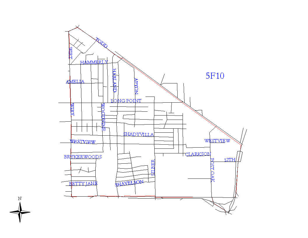 The boundary begins at the intersection of Kempwood and Hempstead Road and goes south on Hempstead to the 610 Loop. Hempstead Road is the responsibility of 3B10's beat. The boundary turns south on the 610 Loop and goes to the intersection of the 610 Loop and Katy Freeway (I-10). The Loop is the responsibility of 5F10. At the Katy Freeway, the boundary turns west and goes to the Hillshire Village City Limits that follows Wirt Road. The Katy Freeway is the responsibility of 18G10's beat. The boundary goes north along the city limits to Westview and continues north on Wirt Road to Kempwood. Wirt Road is the responsibility of 5F10. The boundary turns northeast on Kempwood about a quarter mile to the intersection with Hempstead, which is where it began. Kempwood is also the responsibility of 5F10.