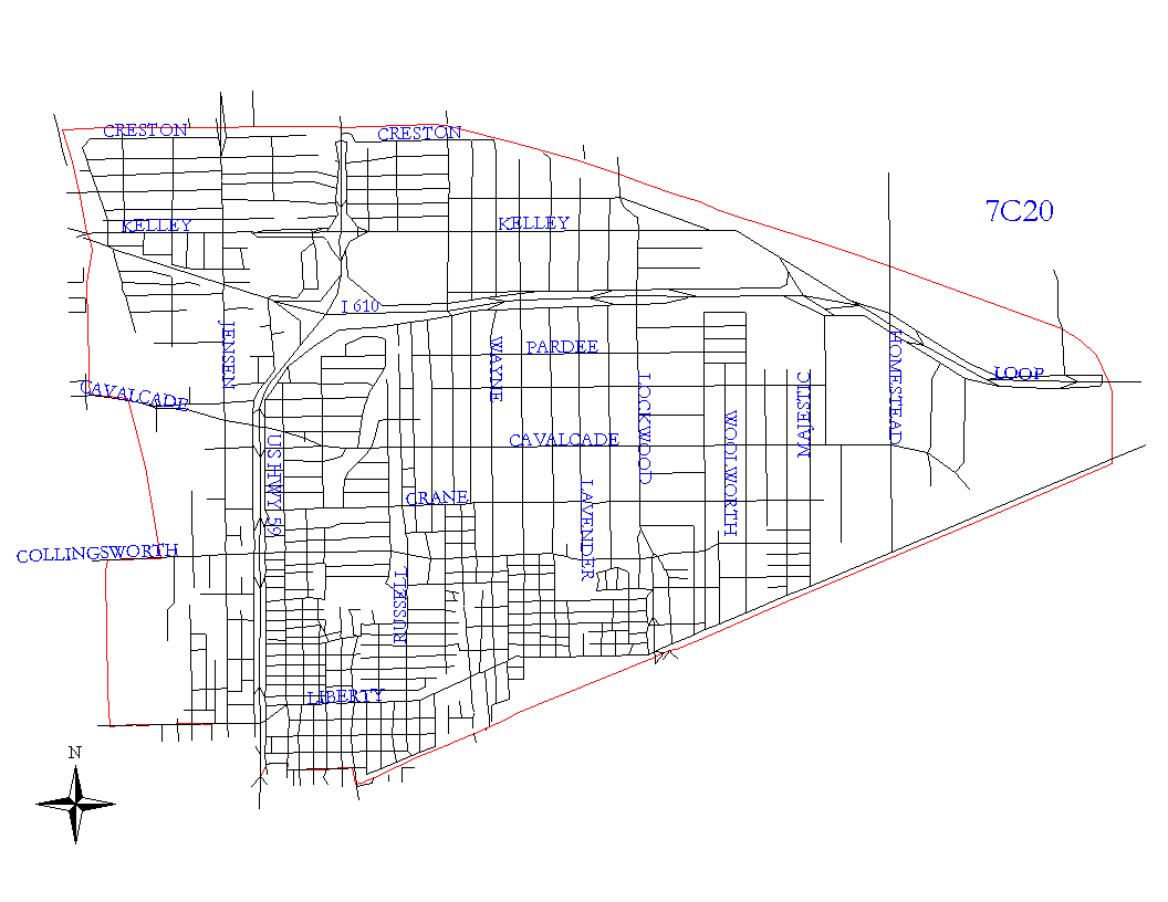 The boundary begins at the intersection of the SPRR railroad tracks between East and West Hardy and the HB&T railroad tracks that run east and west between Lynnfield and Creston Drive. The boundary goes east to a fork in the tracks. The tracks going southeast are the HB&T tracks and the tracks going northwest are MMPR. The boundary goes southeast along the HB&T railroad, and then turns straight south. It crosses under 610 Loop and goes to the SPRR railroad just north of Englewood Yard. The boundary goes southwest along the SPRR railroad and continues along the north side of Englewood Yard to where Noble Street dead ends into the railroad tracks. It turns west along the north lot lines of Noble to the Eastex Freeway. It turns north on the east side of the Eastex Freeway to Quitman. Quitman and Noble are the responsibility of 7C10's beat. It turns west along the north lot lines of Quitman and goes to MPRR railroad tracks. It follows the railroad tracks to the intersection of the HB&T railroad tracks that run east and west between Lynnfield and Creston Drive, which is where it begins.